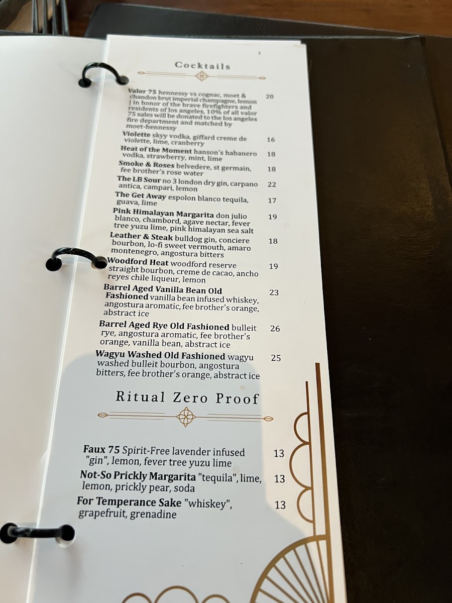 The menu at LB Steak - City Center Bishop Ranch offers a variety of steakhouse and American dining options with a focus on premium cuts and classic accompaniments. Guests can explore a selection of steaks such as Tomahawk Rib Eye for Two, Filet Mignon, lb Signature Steak, and Japanese Wagyu, alongside seafood options like Raw Oysters on the Half Shell and Whole Branzino. Complementing these main dishes are sides including lb Potato, Onion Rings, Brussels Sprouts, Grilled Asparagus, and Pan Roasted Foraged Mushrooms.