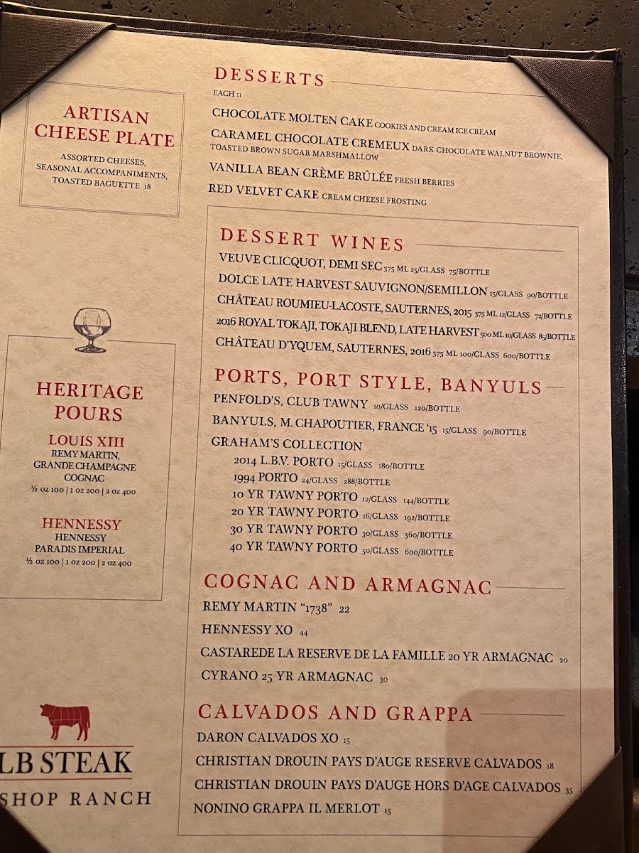 The dessert offerings include items such as Chocolate Molten Cake and Vanilla Bean Crème Brûlée, suitable for concluding the meal.